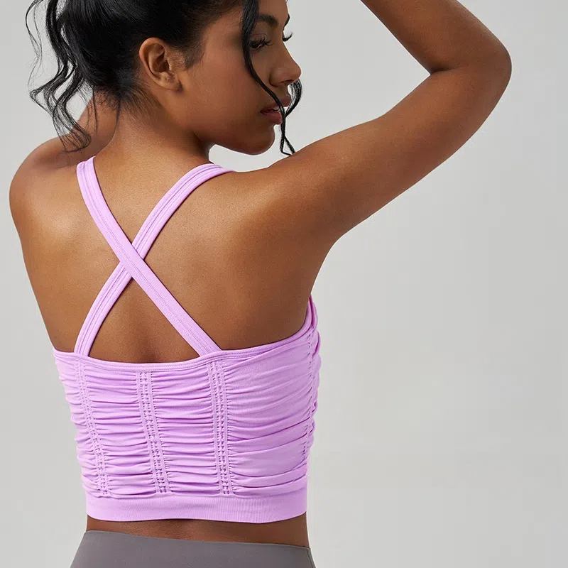 Cut-out smocked back feeling wears a fitness sports bra outside