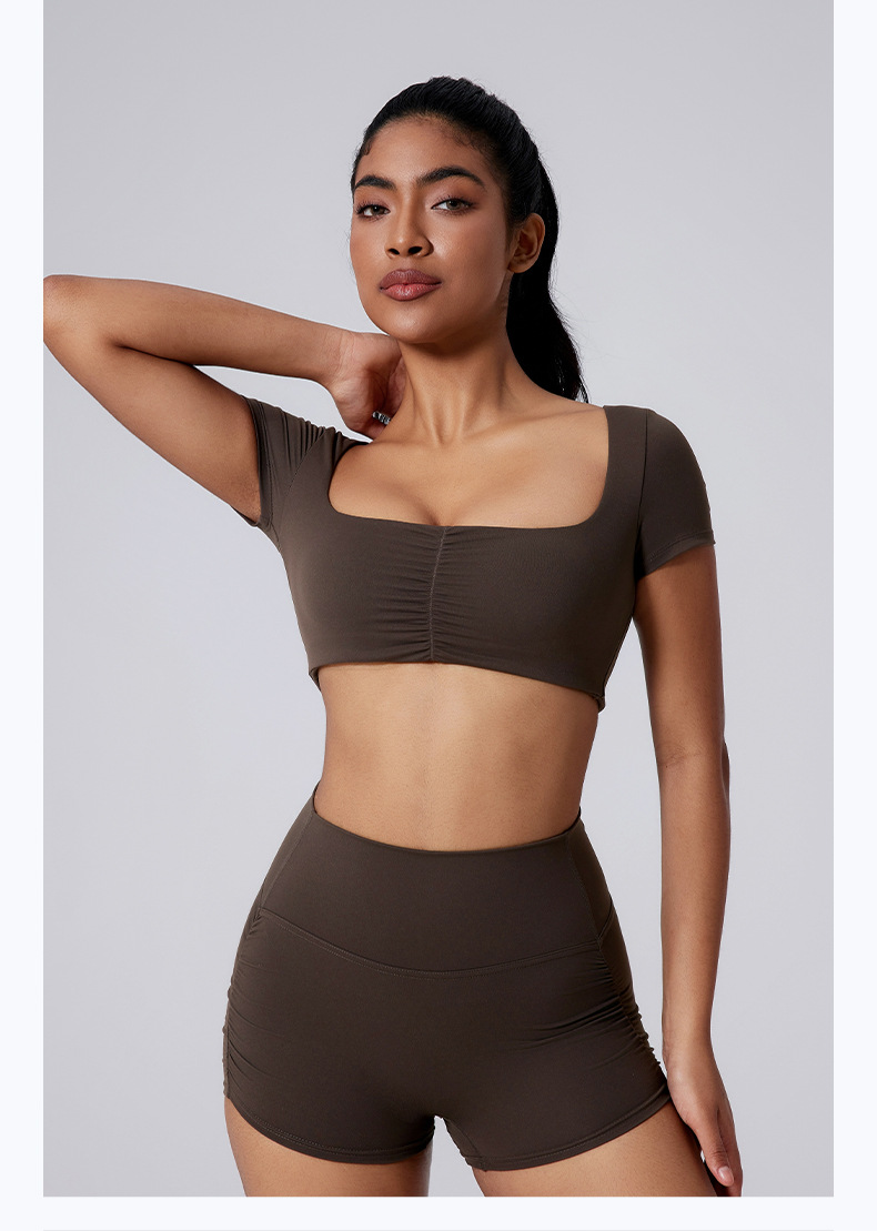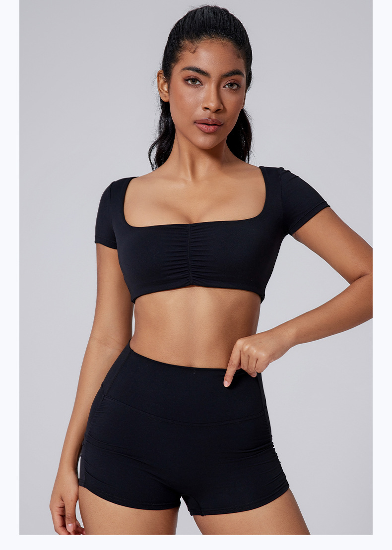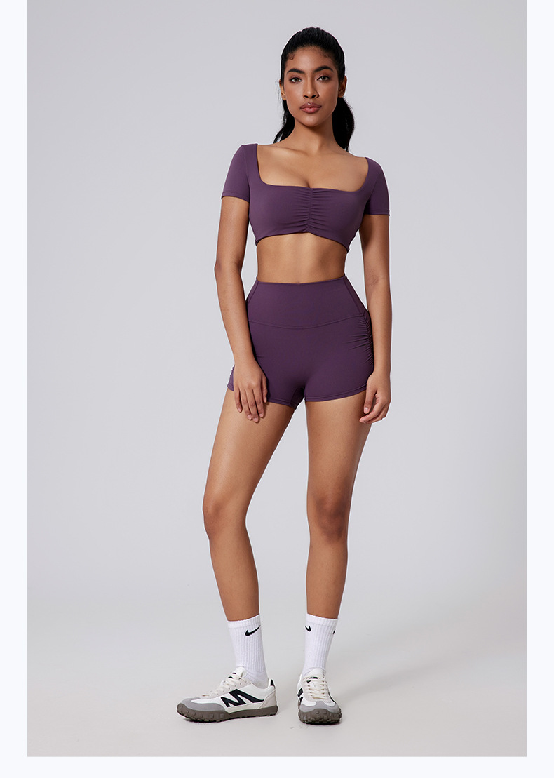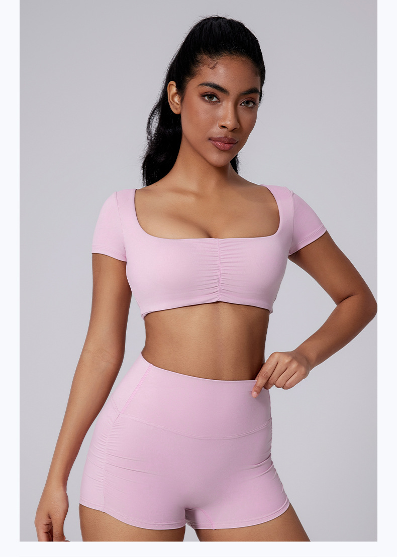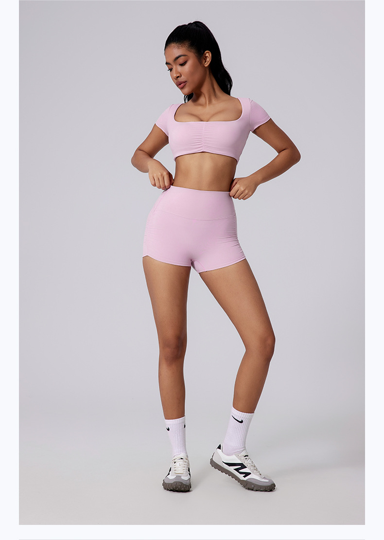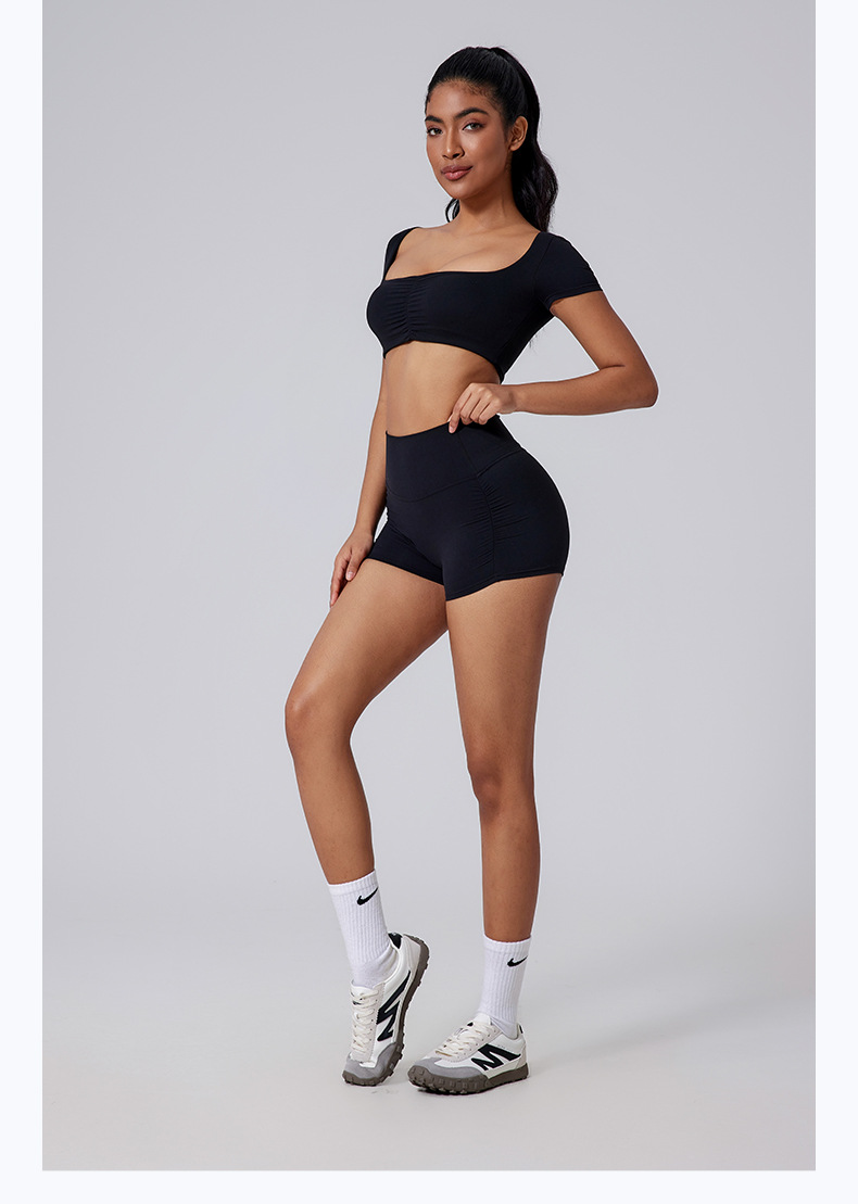 Generous neckline, Open waist, Sexy pleated, Solid color sports short sleeves