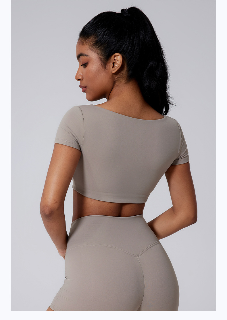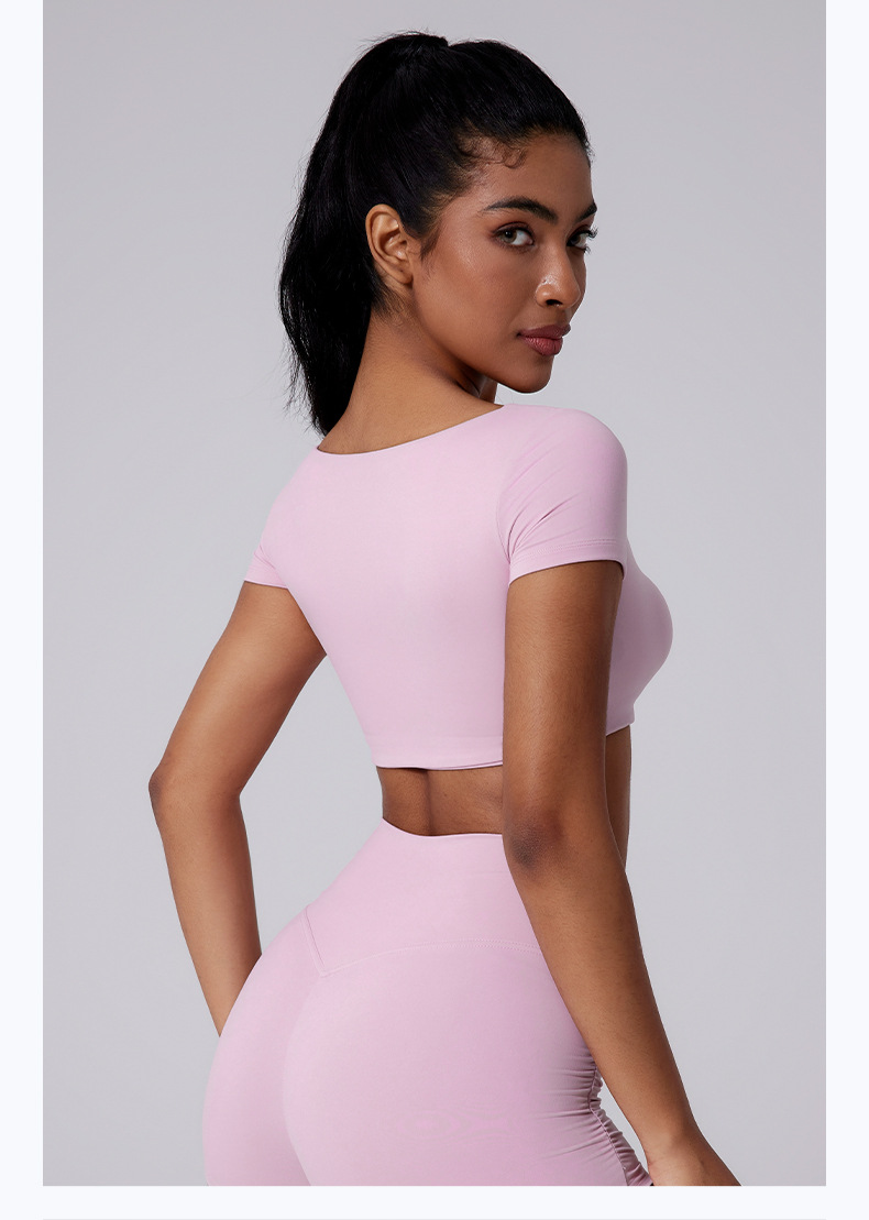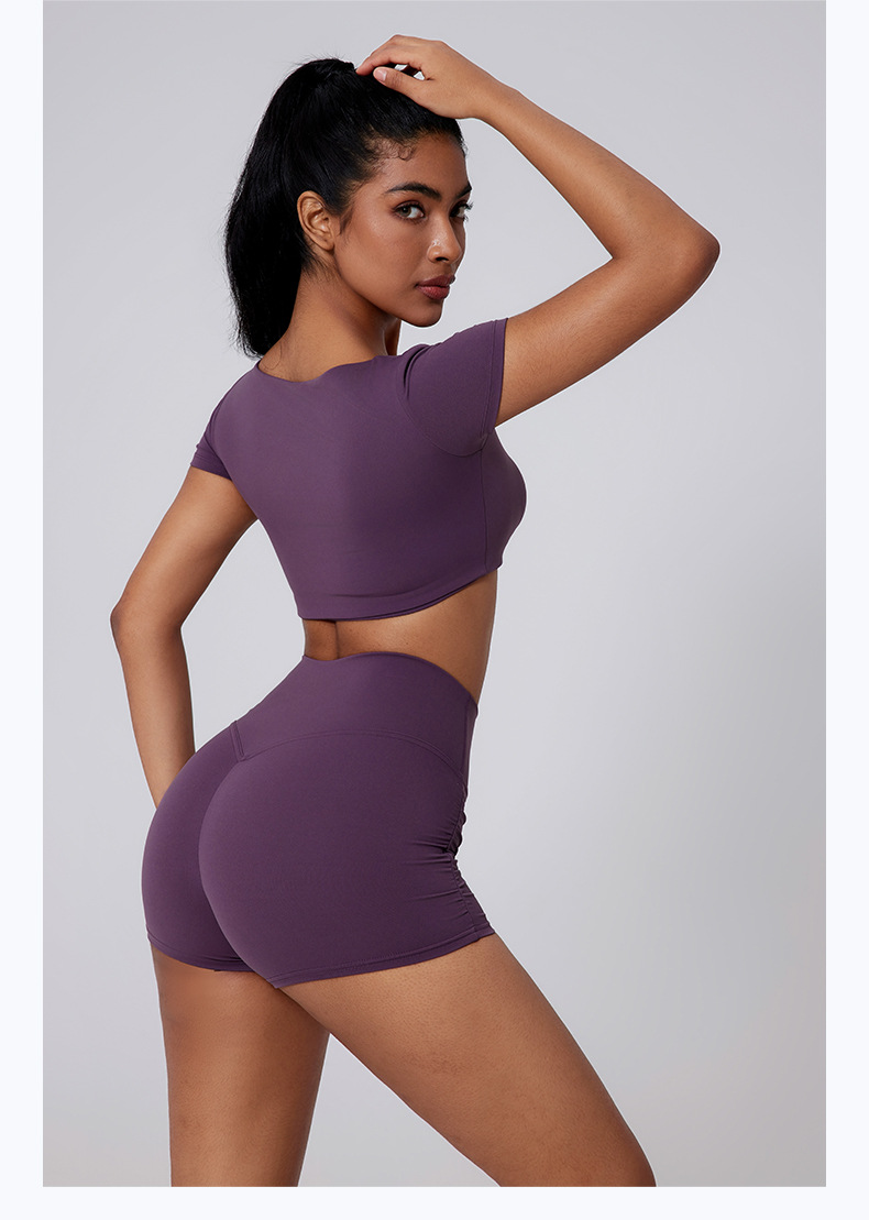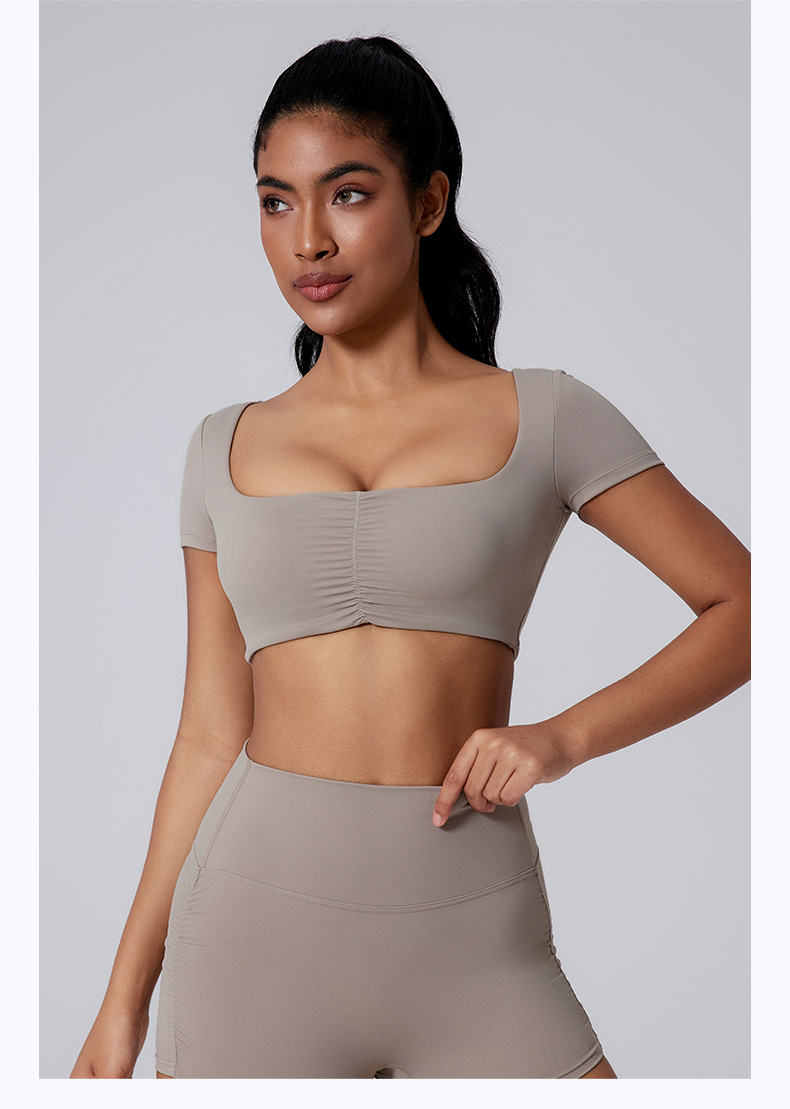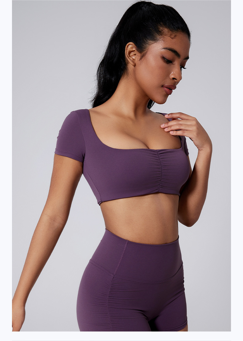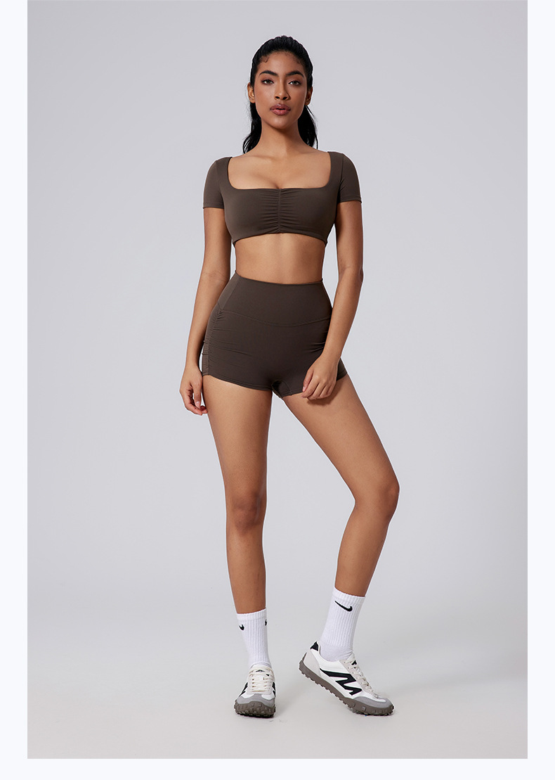 Generous neckline, Open waist, Sexy pleated, Solid color sports short sleeves